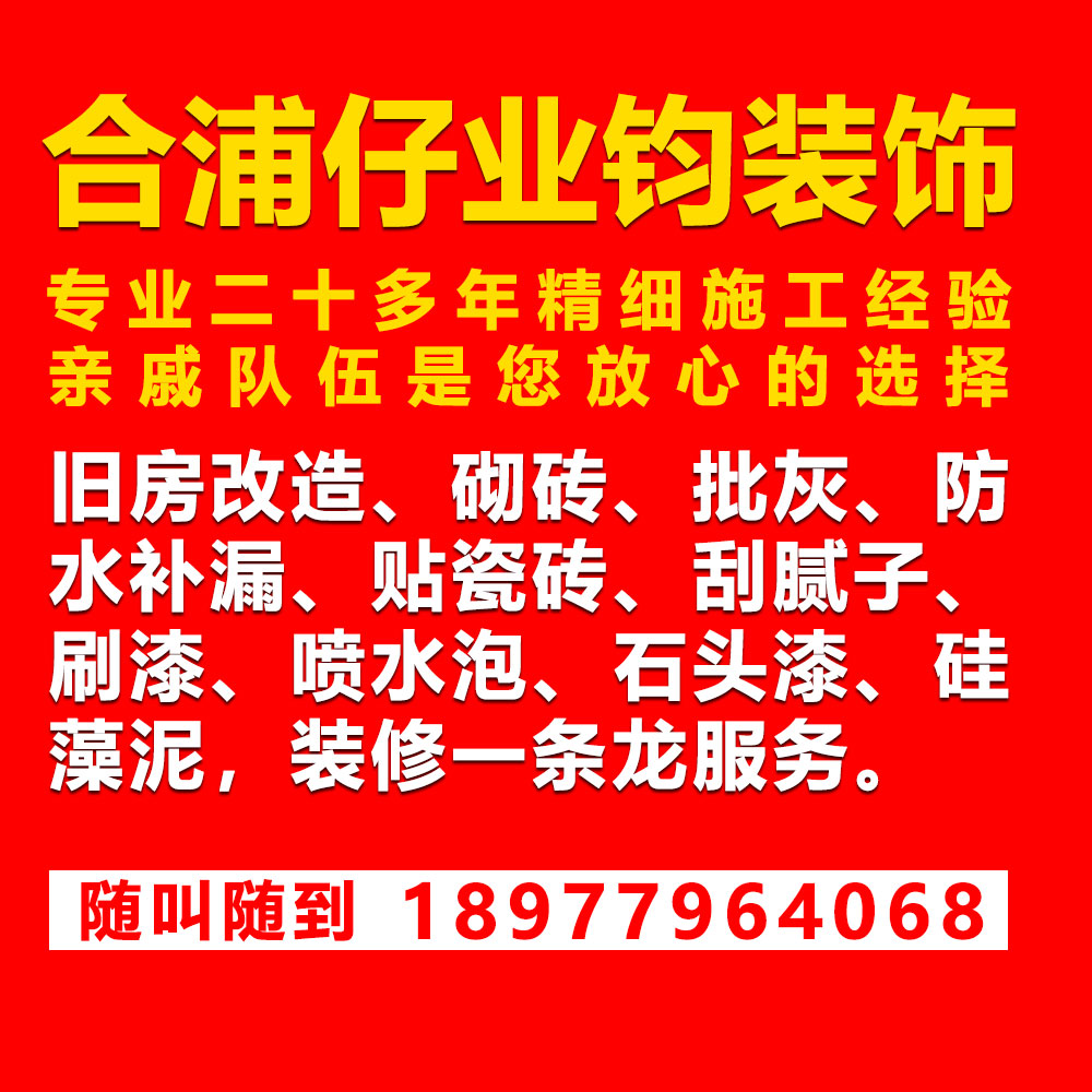 承接旧房改造、砌砖批灰、刮内外墙腻子,旧内墙刮新腻子,刷内外墙漆工程,高弹性拉毛漆,喷石头漆,岩片漆,防水补漏、贴瓷砖、水电等装修一条龙服务。 要装修就找合浦仔冯业钧师傅,电话:18977964068 随呼随到,26年的装修经验,是您放心的选择。 (装修过程使用专业打磨机打磨)