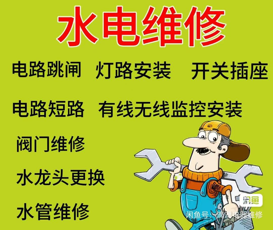 电工维修服务,水电工,水电维修师傅,电工上门维修,开关更换,插座安装增加,电路改造,电路故障排除,水管维修,水管更换改造,水龙头更换,软管更换,角阀更换,卫浴洁具安装,安装地漏 面盆,五金挂件 软管 三角阀 水箱 浴霸安装与维修,安装镜子,置物架,晾衣架,安装吸顶灯,射灯,灯带,布线布管。取断丝,角阀取断丝,水龙头取断丝。专业安装各种灯具,净水机厨宝及升降衣架安装,专业服务,公平交易,用心为您排忧解难!