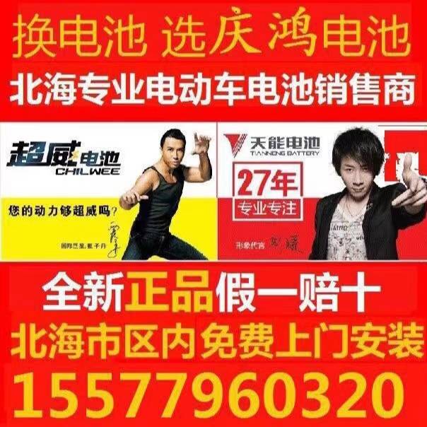 北海市专业上门换天能超威等各大品牌电池,258/组起!!!十六年老店,品质保证,售后无忧。保证全新正品,假一赔十!各大品牌电池都有,活动优惠价,全北海市区免费上门安装!价格绝对的优惠,没有套路,欢迎新老客户来电详询!店铺地址:逢时花园广东路路口,庆鸿电动车电池商行