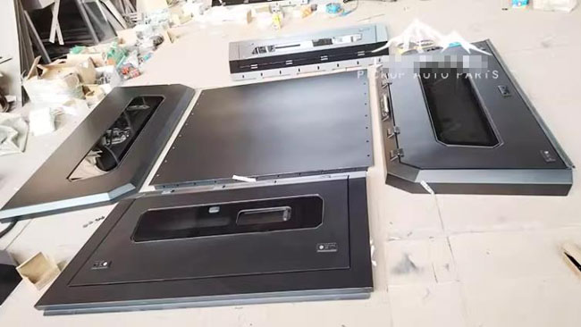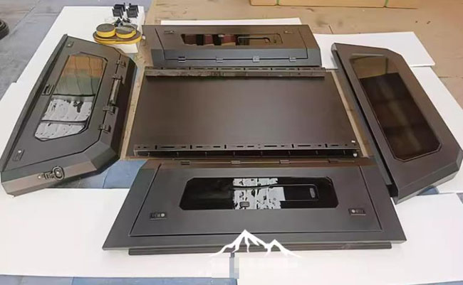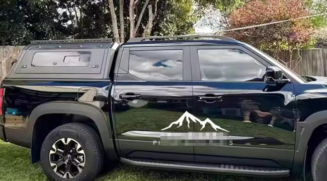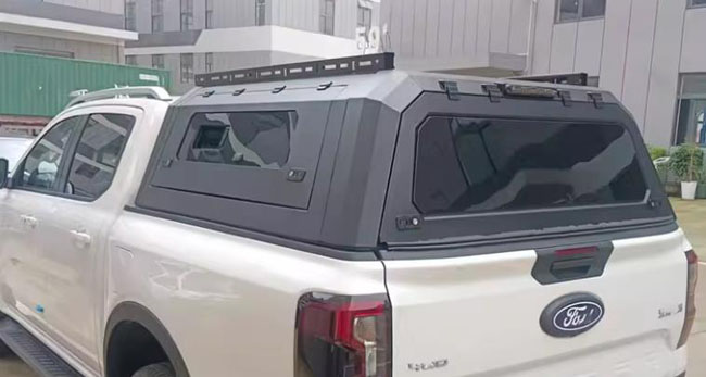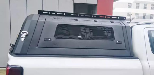 比亚迪鲨鱼皮卡车推拉窗分体后箱盖改装件,锰钢材质,推拉窗设计,便于通风换气,方便实用。遮阳挡雨,防雨防晒。出厂带有高位刹车灯,提高行车安全。一侧带脚蹬,可登盖顶。液压升降,开合灵敏。免打孔安装,带锁防盗。
