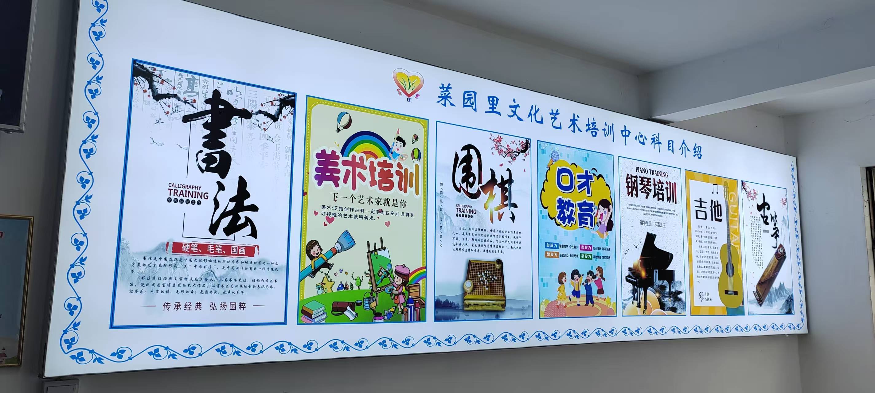 本机构培训场地500平米左右,教学设施完备,环境优美,现有营业中的书法、美术、口才、钢琴、围棋、吉他、古筝等培训项目对外招生。一个老师可进驻一科或两科,也可全科进驻,进驻即可开班。