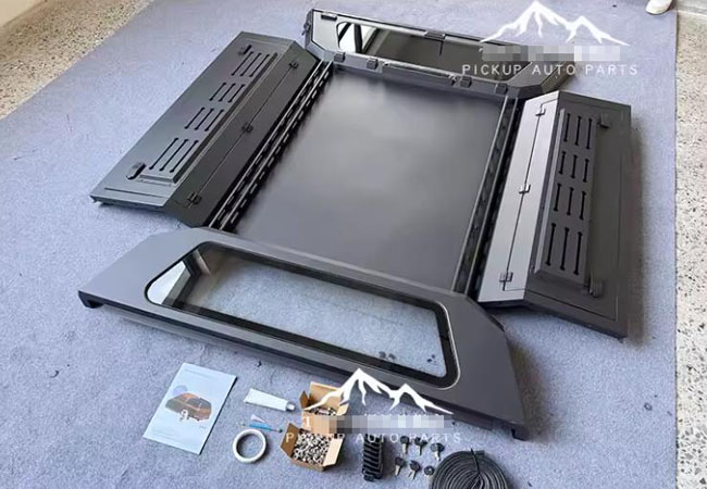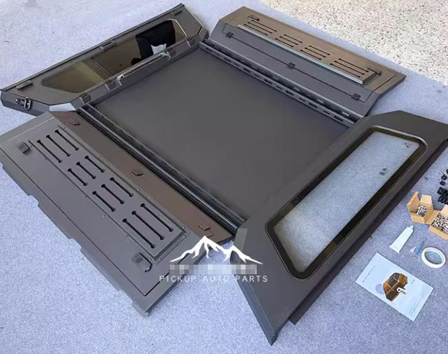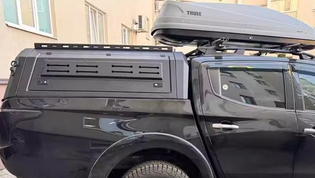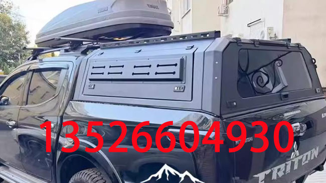 三菱TRITON L200皮卡车三开门分体后箱高盖改装件,锰钢材质,电泳防锈处理,全面覆盖保护。整体打磨,遮阳挡雨,结实耐用。液压升降,灵敏流畅。带高位刹车灯,双侧预留脚蹬安装孔,带锁防盗,质量有保障。