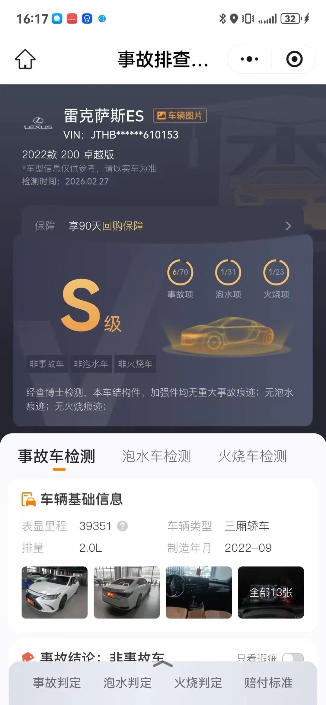 刚刚拿下台22款,22年10月雷克萨斯ES200卓越版,原版基本原版原漆,全程记录3.9万公里,查博士检测S级