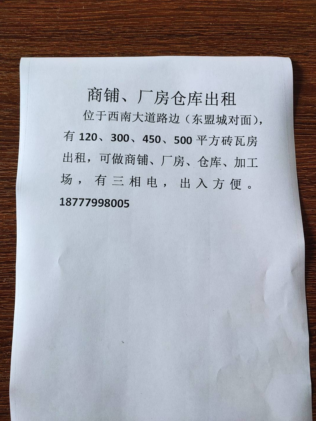 西南大道路边(东盟国际城)对面,有60、120、300、450平方砖瓦房出租,可做厂房、仓库、加工场地。靠近路边,出入方便。