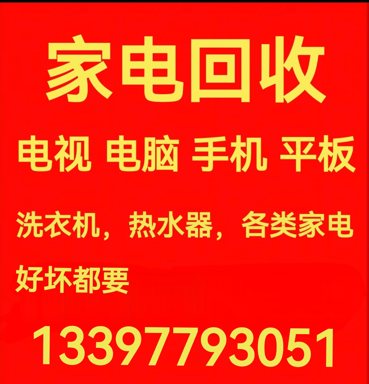 上门回收各类家电:电视,电脑,手机,平板,洗衣机,热水器等各类家电,好坏新旧都收。联系电话:13397793051